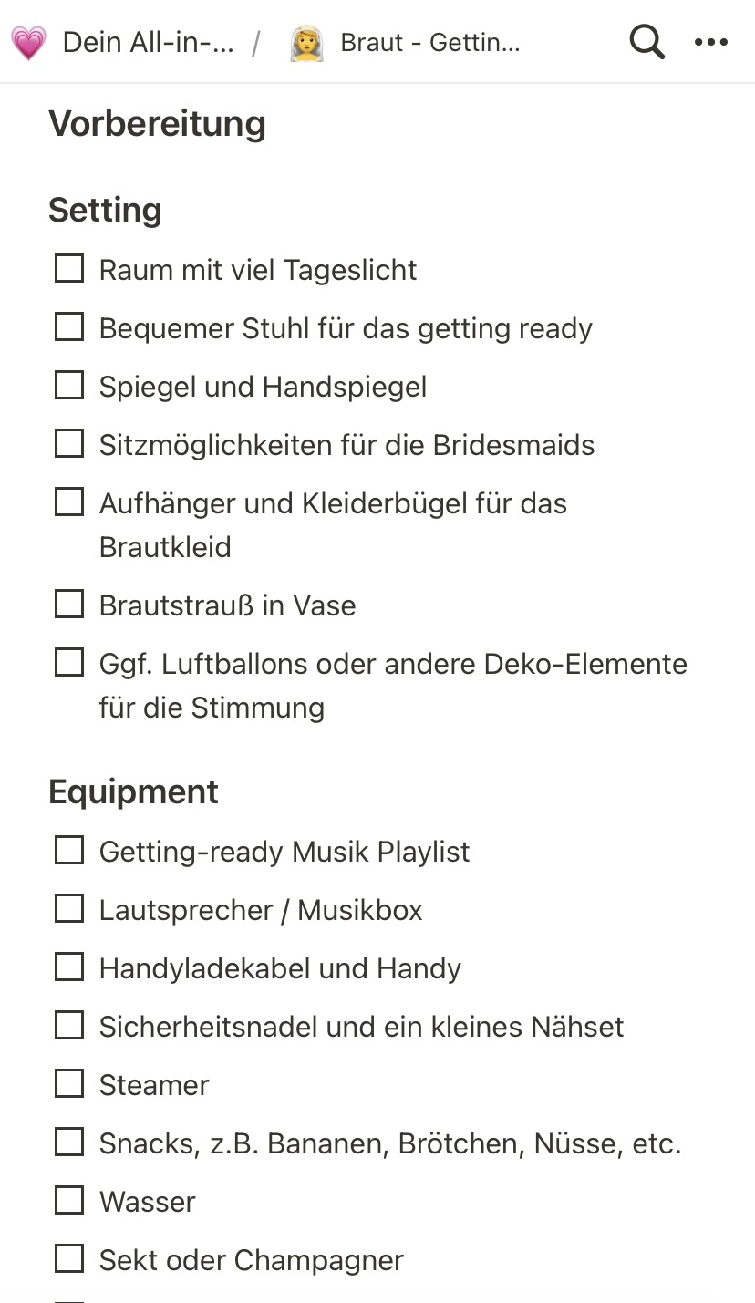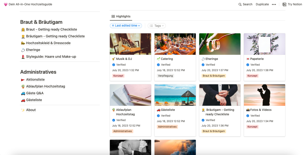 Dieses Notion-Template kombiniert Hochzeitsdesign-Konzepte mit wertvollen Hinweisen und Tipps zur Gestaltung Eurer Traumhochzeit sowie praktischen und detaillierten Checklisten vom ersten Tag der Planung bis zum Hochzeitstag. Es vereint meine persönlichen Erfahrungen von >10 Hochzeiten (inkl. meiner eigenen) mit dem Austausch und der Zusammenarbeit mit verschiedenen Wedding Planerinnen. Auf den jeweiligen Seiten dieser Vorlage findet Ihr relevante Inhalte zu den einzelnen Unterthemen (z.B. Ablauf der Trauung, Sitzordnung, etc.), Tipps zur Nutzung der Inhalte sowie Querverweise zu tollen Dienstleistern und praktischen Add-ins. Euer All-in-One-Hochzeitsguide fungiert somit als individueller Planer und ständiger Begleiter bei der Vorbereitung Eurer Traumhochzeit und ist so konzipiert, dass Ihr nichts überseht. Viel Freude damit!